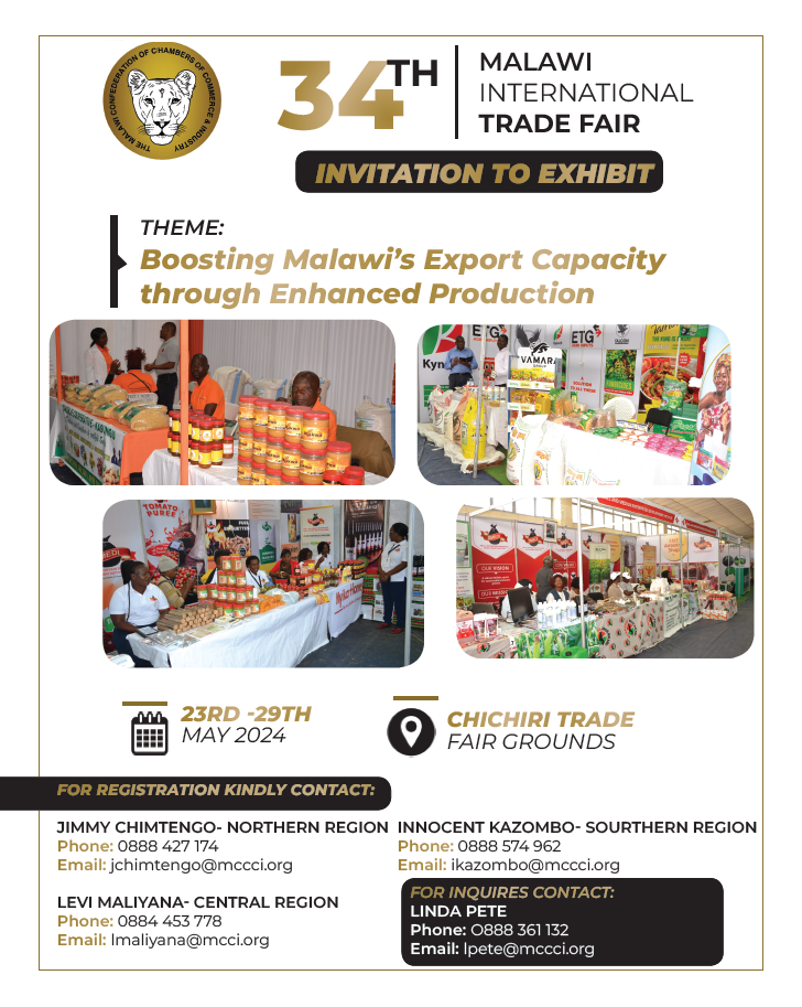 The Malawi Confederation of Chambers of Commerce and Industry has organized the 34th Edition of the International Trade Fair under the theme 'Boosting Malawi's Export Capacity through Enhanced Production'.